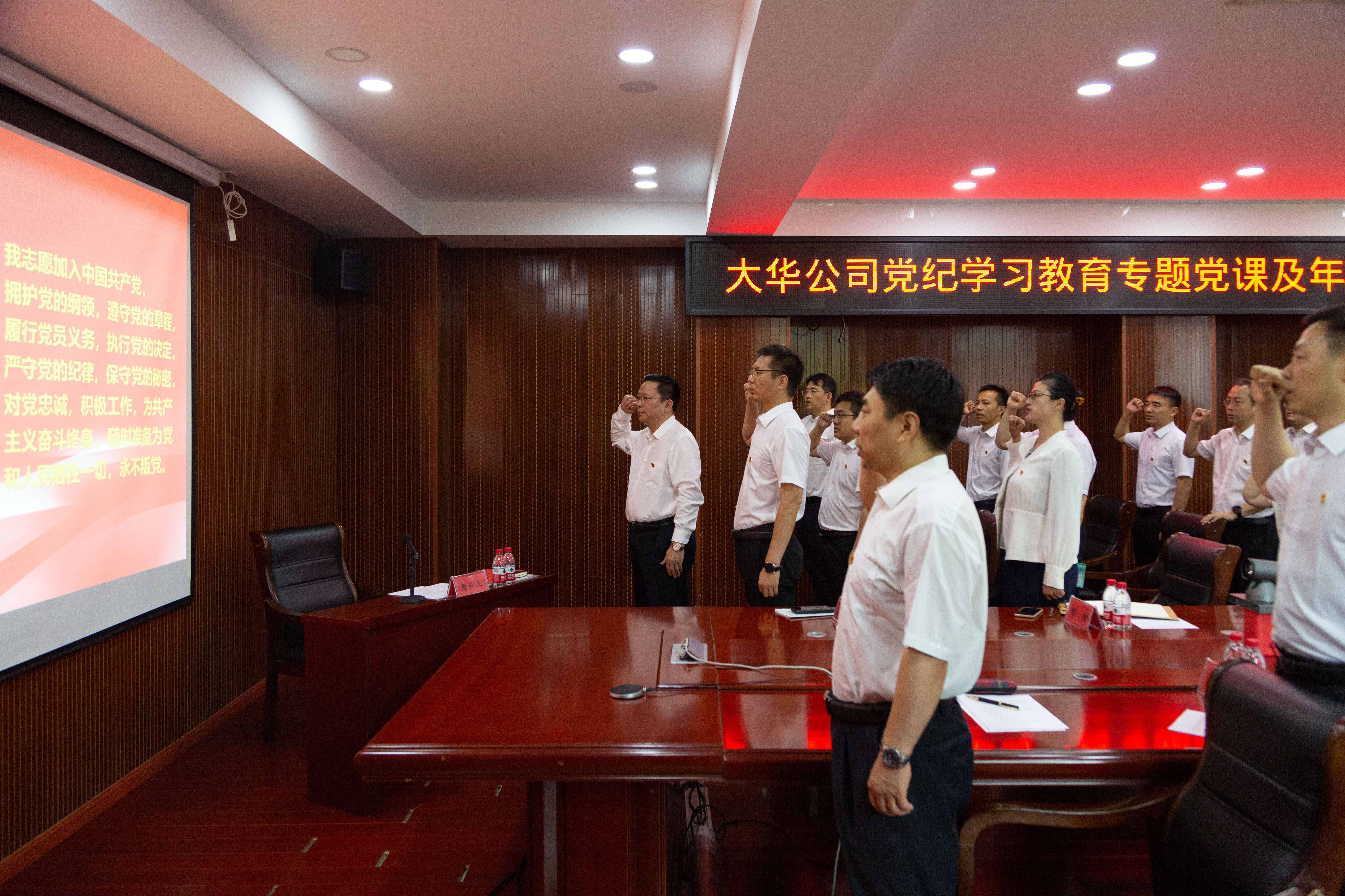 會議開始,大華公司黨委書記、董事長董永生帶領(lǐng)全體黨員重溫了入黨誓詞。
